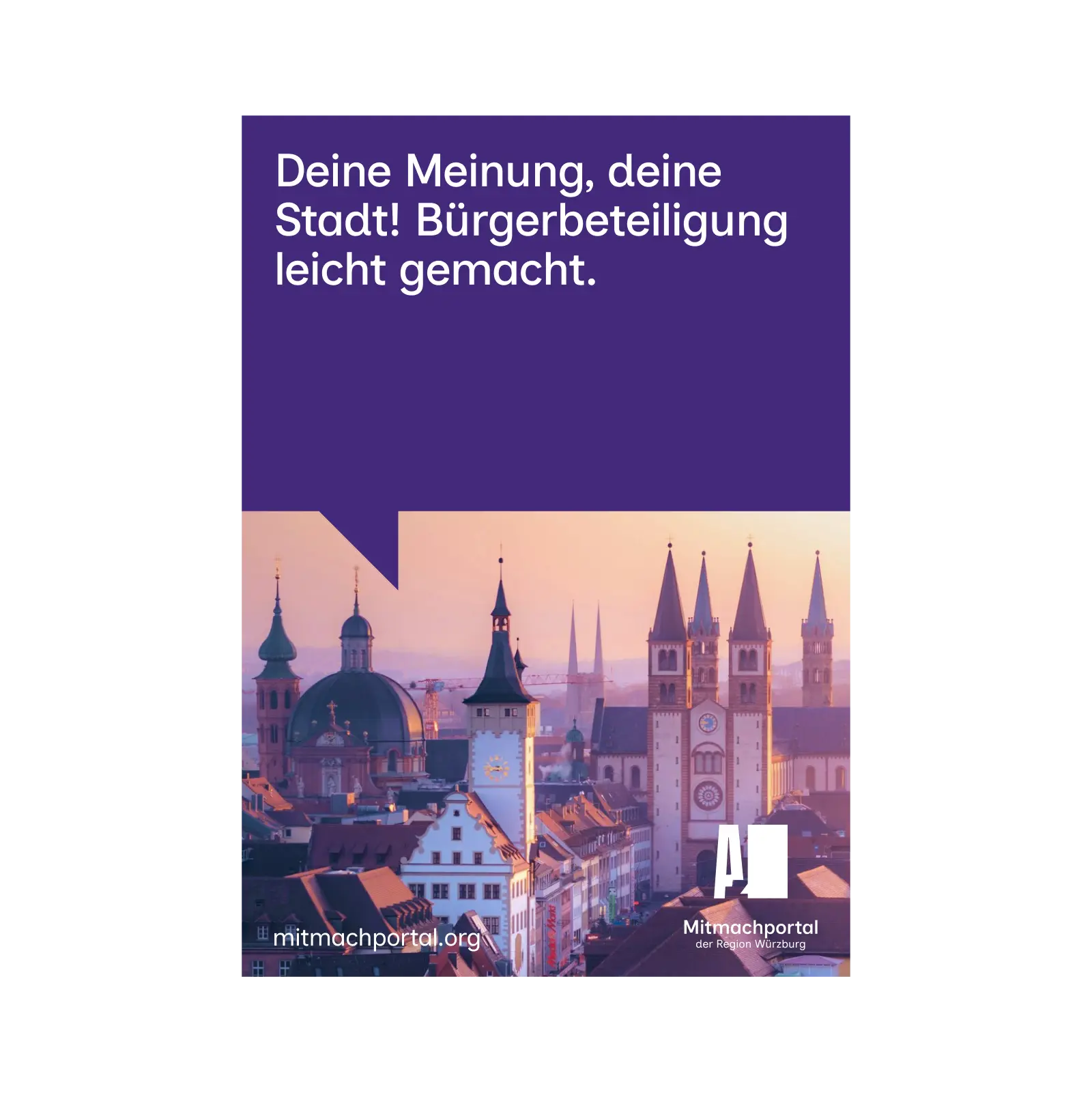 Als zentrales visuelles Element in unserer Gestaltung verwenden wir eine markante, trennende Farbfläche. Beim Mitmachportal endet diese in einer klaren, geraden Linie, die nahe dem Rand in ein nach oben abstehendes Dreieck übergeht – eine abstrahierte Sprechblase, die den Dialog zwischen Bürger:innen und Verwaltung symbolisiert. Der Abstand zum Rand beträgt stets die Breite des Dreiecks. Die Sprechblase wird proportional an die Breite oder Höhe des Formats angepasst, sodass das Dreieck in jeder Anwendung seine prägnante Form und Wirkung behält.
